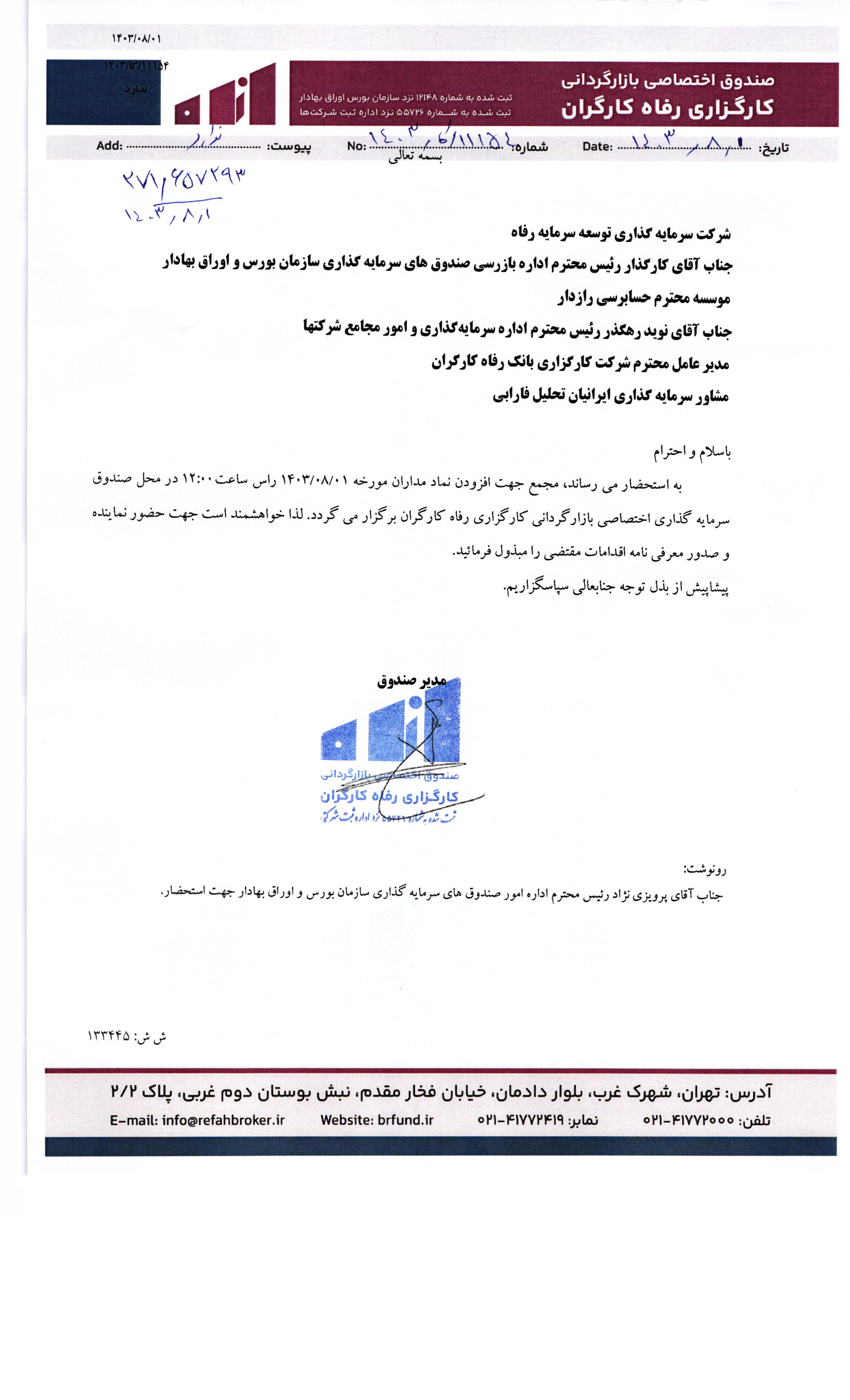 دعوتنامه مجمع صندوق سرمایه گذاری اختصاصی بازارگردانی کارگزاری رفاه کارگران