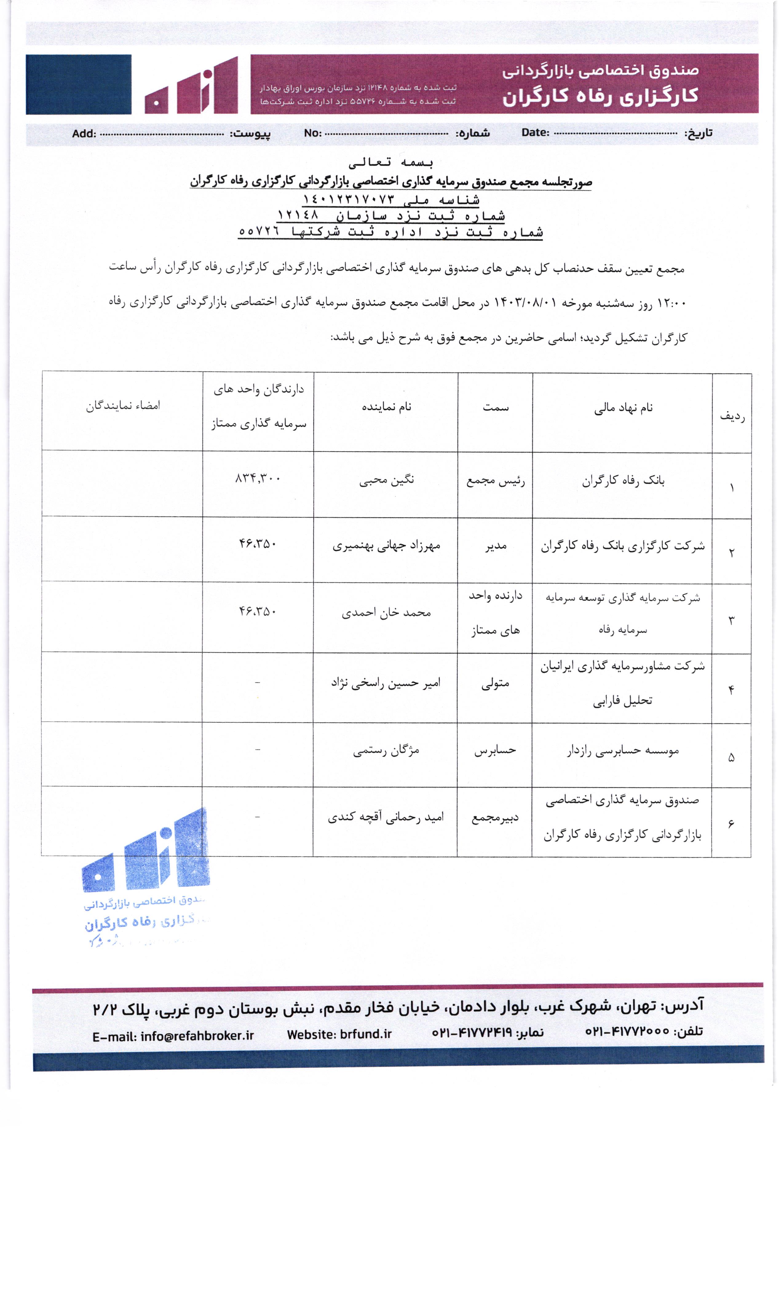 صورتجلسه و اسامی حاضرین در مجمع تصمیم گیری در خصوص ابلاغیه ۱۲۰۲۰۲۱۸ صندوق بازار گردانی کارگزاری بانک رفاه مورخ ۱۴۰۴/۰۵/۰۸